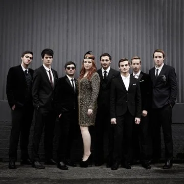 A 6-piece postmodern jukebox style jazz band, playing modern songs in a vintage style.